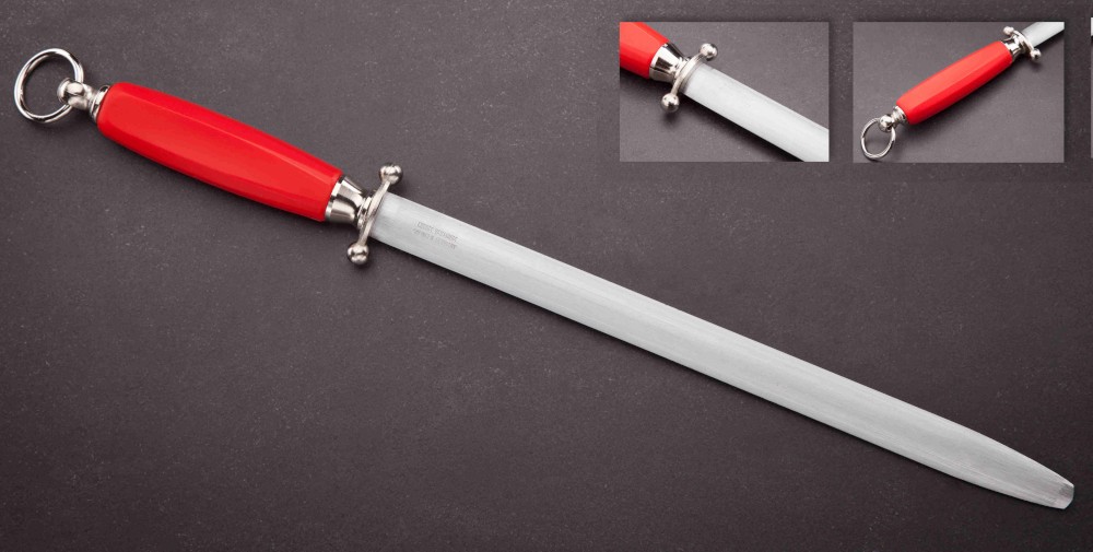 La gama más completa de aceros y el mejor precio para mantener su cuchillo. Tan importante para el cuidado de su herramienta como la propia calidad del mismo. El uso adecuado del estriado, sumado a la calidad del acero de SOLINGEN garantizan una mayor durabilidad de sus cuchillos así como un mayor rendimiento. Longitud 31 cm, con estriado fino. Mango rojo c/protección roscado.